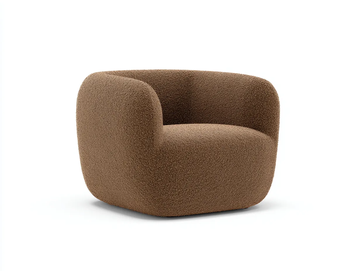 El sillón está revestido en tejido bouclé de color marrón canela, pensado para un uso interior habitual. La textura de la superficie aporta profundidad visual y una imagen más envolvente, reforzando el carácter acogedor de la pieza. Su estructura de líneas redondeadas integra respaldo, brazos y base en un solo conjunto, creando una apariencia fluida, moderna y fácil de incorporar a distintos ambientes del salón.