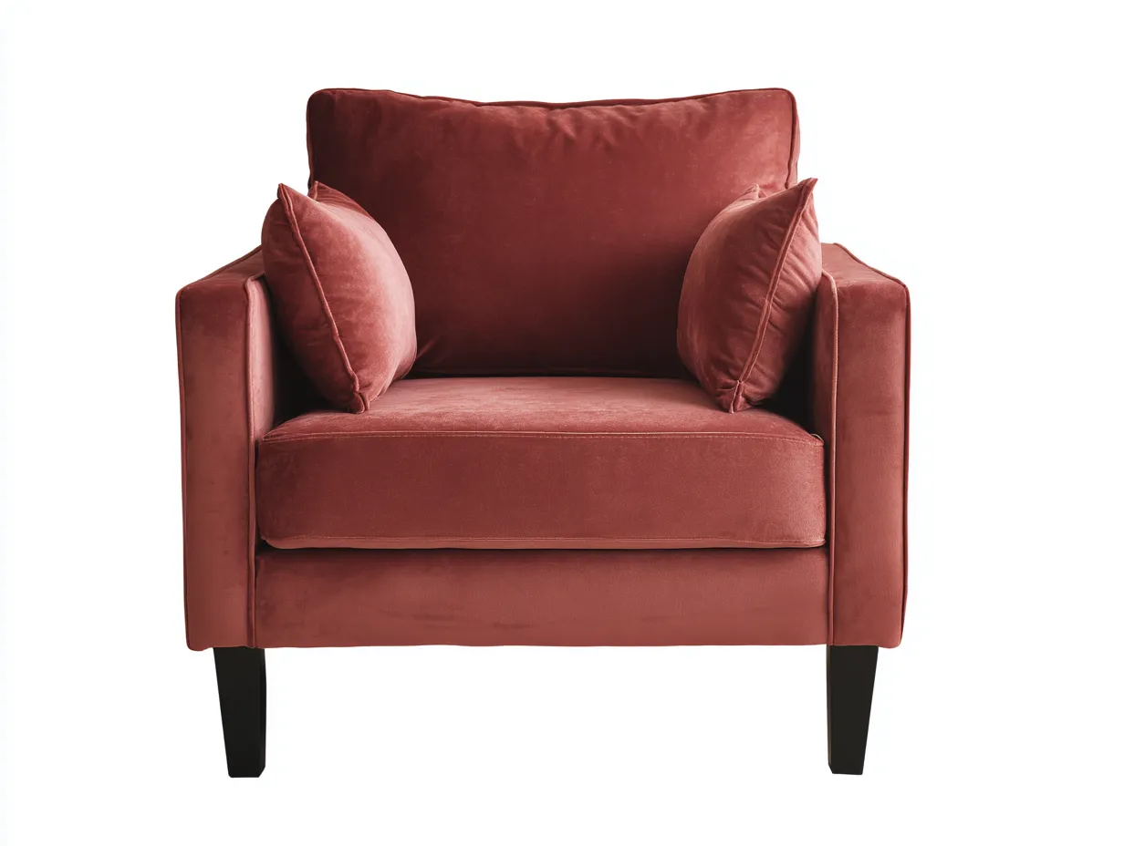 El sillón está revestido en terciopelo de color terracota rosado, pensado para un uso interior habitual. La textura suave del tejido aporta profundidad visual y una apariencia más acogedora. Los reposabrazos rectos, el respaldo mullido y las patas en negro crean un contraste elegante, mientras que los cojines laterales completan una silueta armoniosa y funcional que se integra con facilidad en diferentes propuestas decorativas.