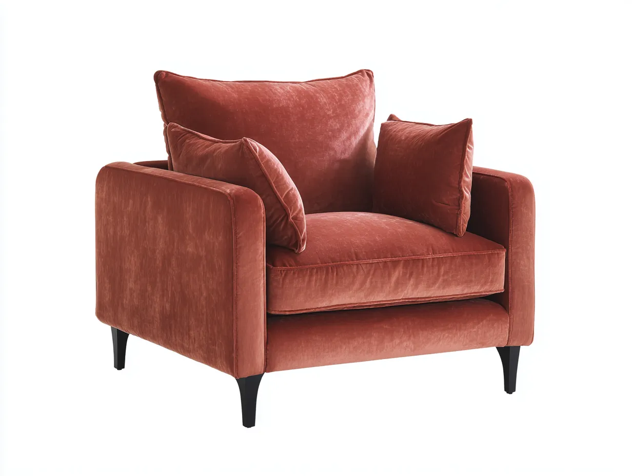 El sillón está revestido en terciopelo de color coral teja, pensado para un uso interior habitual. La textura suave del tejido aporta matices visuales delicados y refuerza la sensación de calidez en la estancia. Los reposabrazos rectos, la base tapizada y las patas finas en negro crean un contraste equilibrado, mientras que los cojines sueltos completan una silueta elegante, cómoda y fácil de integrar en diferentes estilos decorativos.