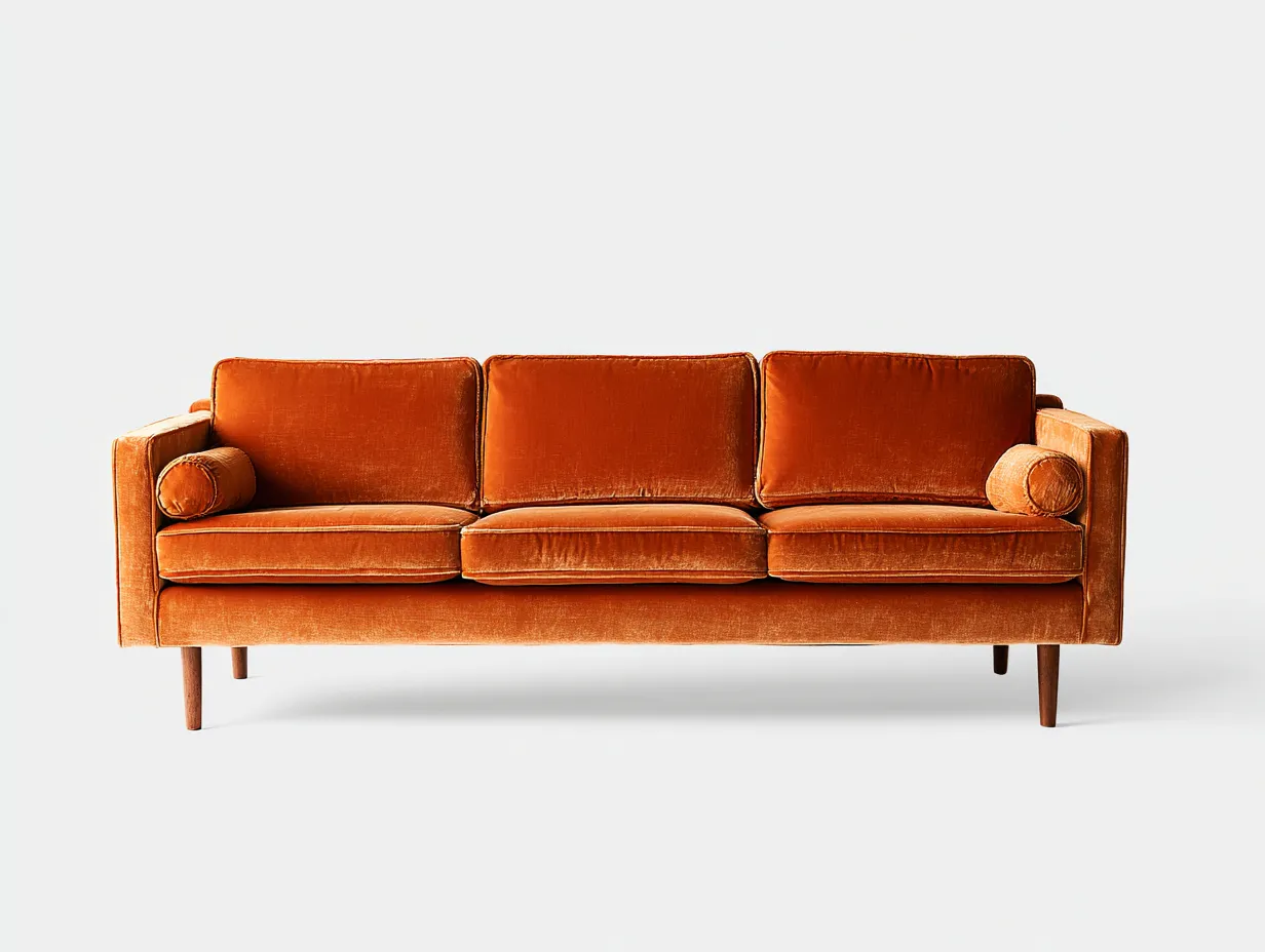 Este sofá de tres plazas de terciopelo en color naranja tostado aporta al salón un efecto visual vibrante, sofisticado y con gran valor decorativo. Su diseño combina líneas limpias y equilibradas con tres amplios cojines de respaldo, garantizando comodidad y un soporte uniforme en el uso diario. El tejido de terciopelo intensifica la profundidad del color y crea sutiles juegos de luz y sombra, enriqueciendo el conjunto visual. Gracias a sus proporciones armoniosas y su apariencia elegante, este sofá se integra de forma natural en salones de estilo moderno, clásico o de inspiración de mediados de siglo.
